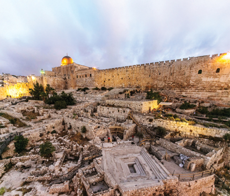 APPROACHING THE TEMPLE. During the late Second Temple period (first century BCE–first century CE), thousands of Jewish pilgrims journeyed to the Jerusalem Temple to observe the annual religious festivals. Before reaching the sacred precinct, pilgrims first passed through the Ophel, a busy ceremonial and commercial area just south of the Temple Mount where they could purify themselves in stepped pools (including the large pool at the bottom of the photo) but also exchange money, buy sacrificial animals, and meet fellow pilgrims. New excavations just outside the walls of the Old City have revealed fresh insights into the pilgrimage practices that took place near the Temple gates.