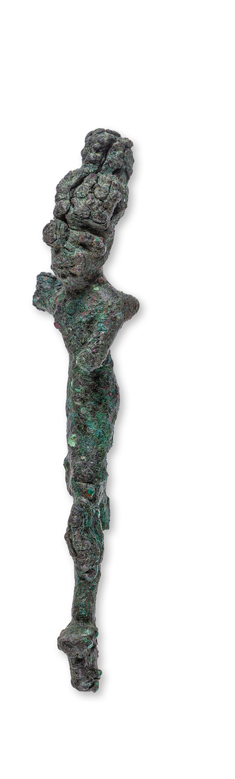 CANAANITE LEGACY. Khirbet al-Ra‘i’s cultural richness was evident in the cult spaces and objects discovered especially near the site’s summit in Area D. This 4-inch-tall bronze “smiting god” figurine, immediately recognizable as a Canaanite form, was discovered in a cult building that dates from the 13th to 12th centuries BCE, when the site was likely inhabited by Canaanite locals.