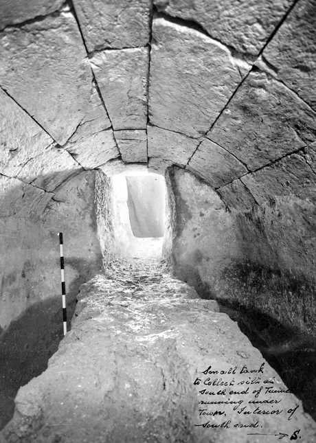 INSIDE THE AQUEDUCT. As the Lower Aqueduct passed under the low ridge upon which ancient Bethlehem was built, the water would flow through this barrel-vaulted chamber where the accumulated sediment would settle to the bottom. The result would have been a clear stream continuing on through the tunnel, out through an opening on the north side of the city, and onward toward Jerusalem and the Temple Mount. Although the tunnel is now blocked, this 1940 photograph by Palestine Mandate antiquities inspector Dmitri Baramki shows the tunnel’s southern entrance when it was still accessible.