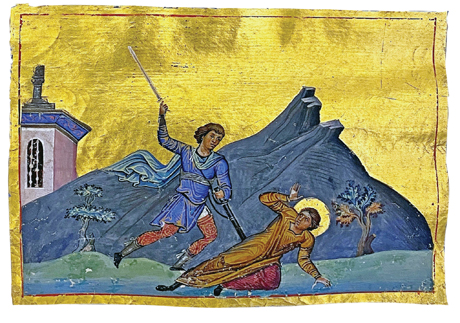 SLAYING THE SAINT. The lavishly decorated Menologion of Basil II—a liturgical book produced on parchment around 1000 CE—contains a collection of saints’ lives arranged according to the church calendar. Illustrating the section on Neophytos of Nicea, who was martyred in 303, this page depicts the saint’s execution by a Roman soldier on the shores of Lake Ascania (Lake İznik), outside the city. Some suggest a simple shrine was built on the spot shortly after his death to commemorate this early Christian martyr.