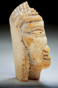 Excavations on Jerusalem’s southeastern ridge, which was the heart of the city during the time of the biblical kings, have yielded a rare and precious find: a small piece of ivory, less than an inch tall, carved in the shape of a woman’s head. Broken in half in antiquity, the face exhibits narrow eyes, prominent lips, an Egyptian hairstyle, and a headband with a small square element on the side. Given its diminutive size, the piece likely decorated a larger object, such as a piece of fine furniture.